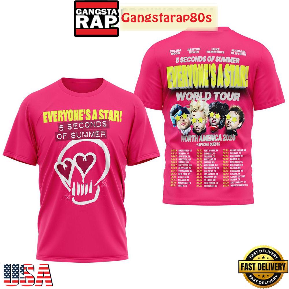 Don’t miss your chance to own a piece of this extraordinary journey. Perfect for summer festivals, casual day wear, or as a gift for fellow 5SOS fans, this shirt is made for true enthusiasts who want more than just merchandise – they want a piece of the memorable concert experience. Celebrate the music, the passion, and the unforgettable moments with the 5 Seconds of Summer Everyone’s A Star World Tour 2026 3D Shirt.