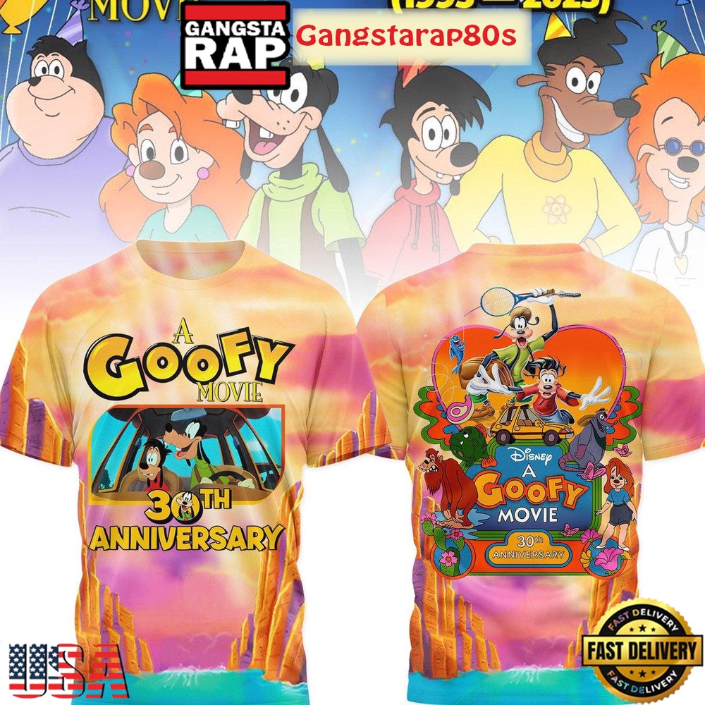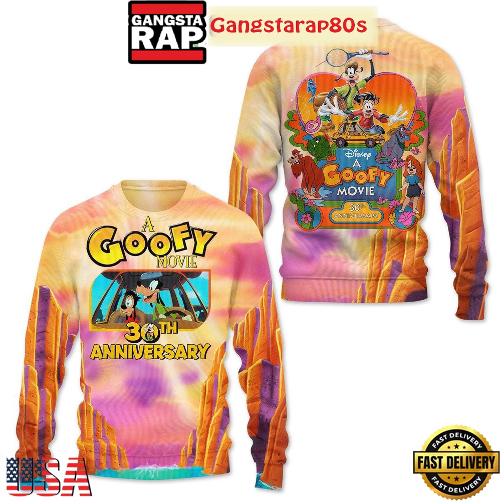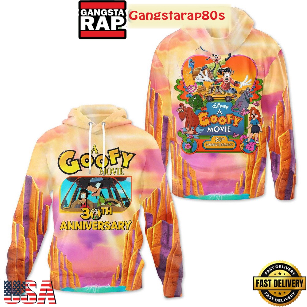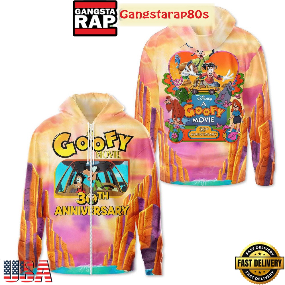 Searching for the perfect gift for a Disney enthusiast? Look no further. The A Goofy Movie 30th Anniversary All Over Print T-Shirt Hoodie is tailored for the modern Disney fan who appreciates a blend of style, comfort, and cinematic history. Add a touch of magic to your apparel collection with this exquisite piece, a limited edition celebration of one of Disney’s most unique adventures.