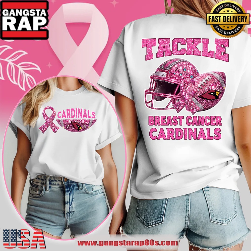 Arizona Cardinals NFL Glitter Tackle Breast Cancer 2025 White Women’s 3D Shirt