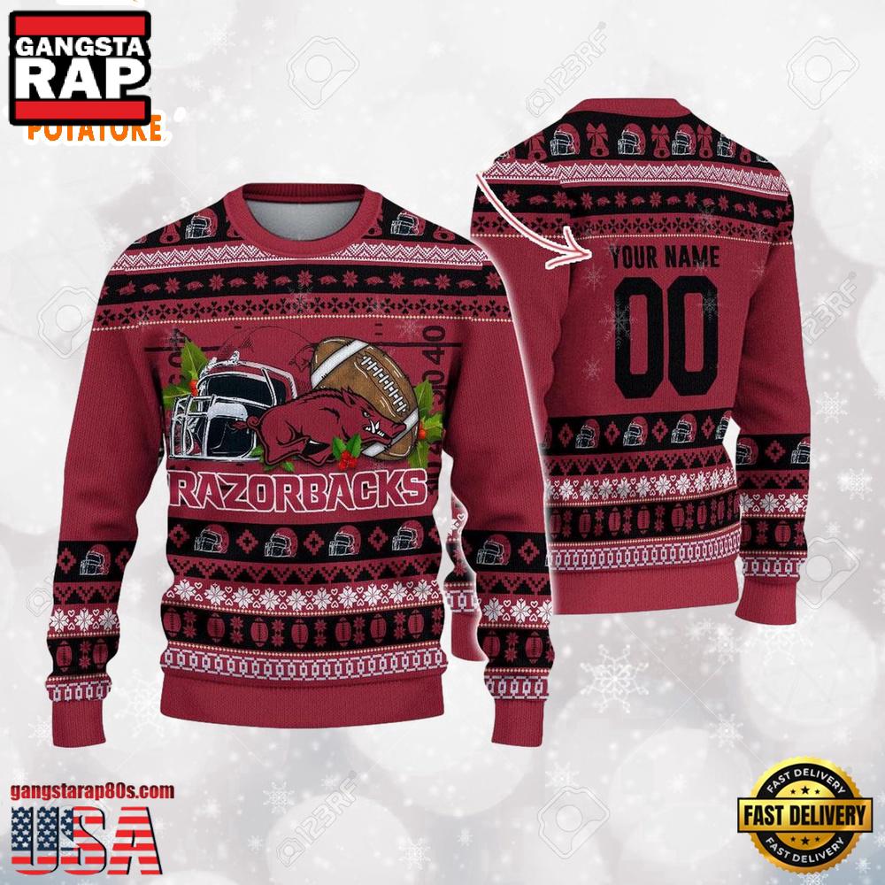 Celebrate the holiday season in true fan style with this Arkansas Razorbacks Logo Football NCAA Ugly Christmas Sweater. Designed to showcase your team spirit with festive flair, it’s the ideal choice for any dedicated Razorbacks supporter. This sweater seamlessly combines your love for the Arkansas Razorbacks with the whimsical charm of an ugly Christmas sweater, making it a must-have for 2023 holiday apparel.