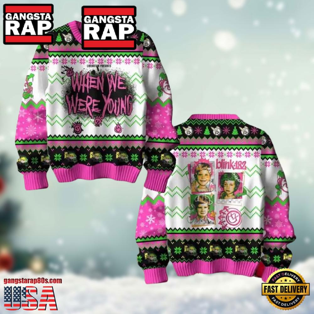 Crafted in 2023, these sweaters embody the youthful rebellion and high energy of your favorite era, with designs that reflect the vibrant punk-rock aesthetic synonymous with Blink-182. The When We Were Young print combines classic album art with cheerful holiday motifs, creating a unique ensemble that stands out in any holiday gathering.