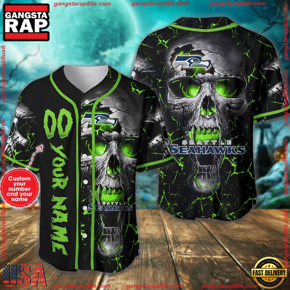 Photos Of Custom Name And Number Seattle Seahawks NFL Team Skull Baseball Jersey Shirt