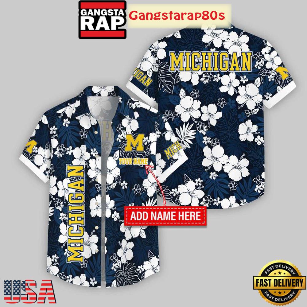 Photos Of Custom Name Michigan Wolverines Hibicus Pattern Aloha Hawaiian Shirt