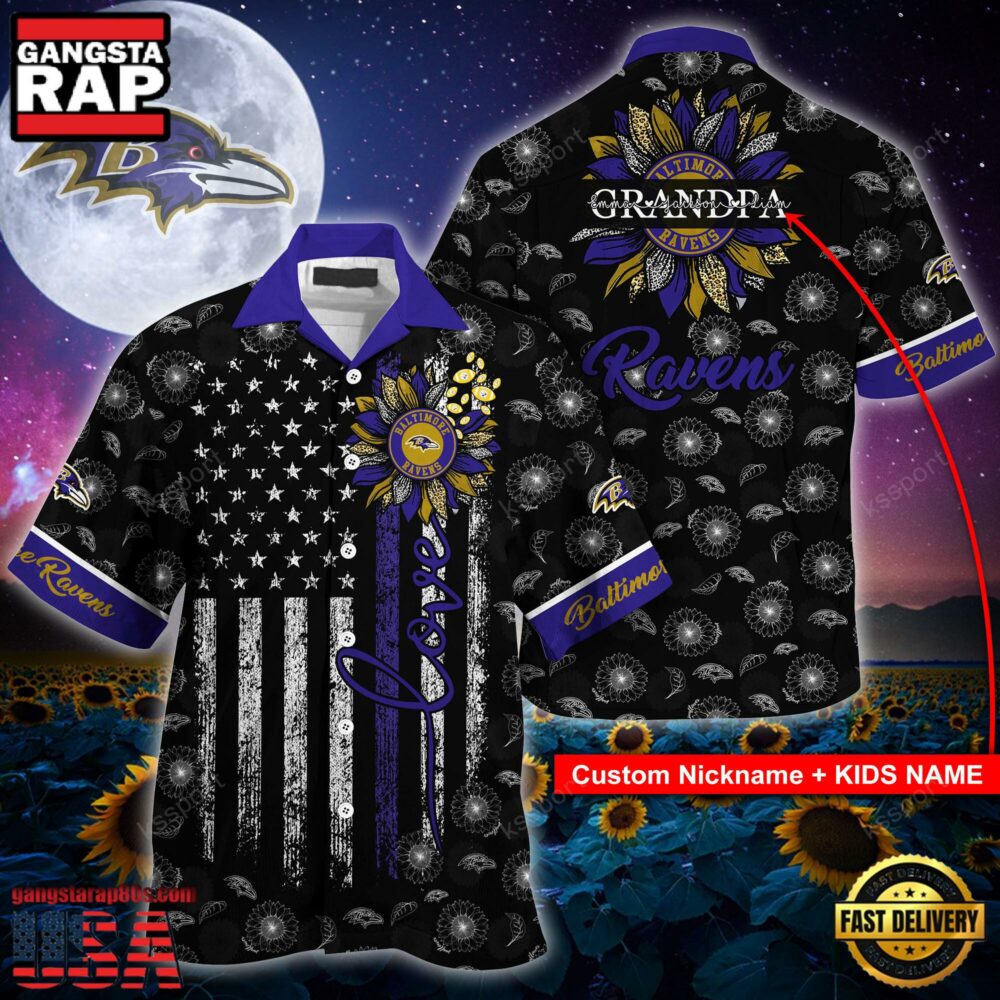 Photos Of Custom Name NFL Baltimore Ravens Sunflower For Mother Day Father Day Hawaiian Shirt