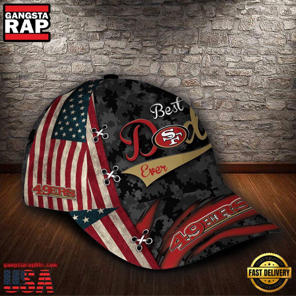 Introducing the Custom Name NFL San Francisco 49ers Best Dad USA Flag New Design Baseball Cap, the perfect accessory for any loyal 49ers fan and proud parent. This cap not only celebrates your favorite team but also the special bond with the dad in your life. With its new design, it reflects both style and patriotism, making it a standout piece for game days and casual outings alike.