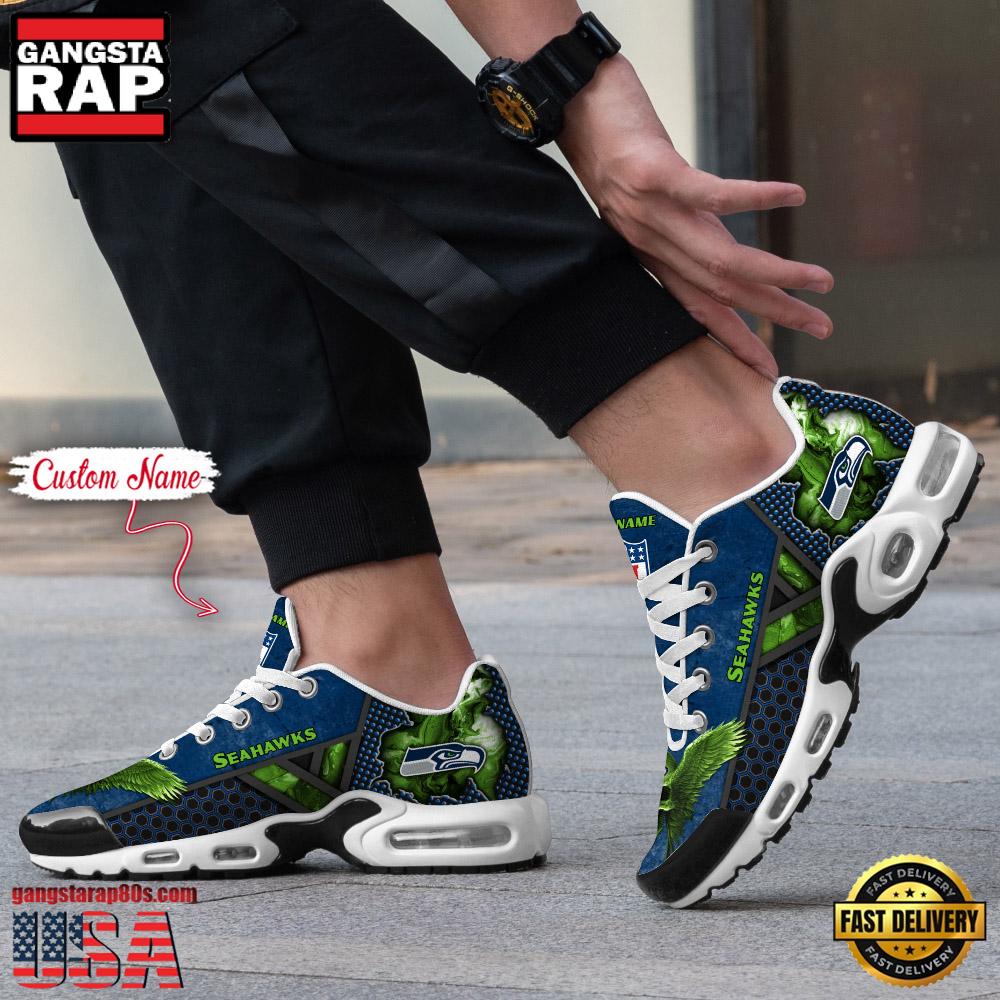 Step into the world of ultimate fan fashion with the Custom Name NFL Seattle Seahawks Skull Air Max Plus Running Shoes For Men Women. These uniquely designed sneakers are not just for the regular fan, but crafted for those who live and breathe the Seattle Seahawks. Featuring a distinctive skull design, these shoes express boldness and individuality, making them a perfect addition to any fan’s collection.