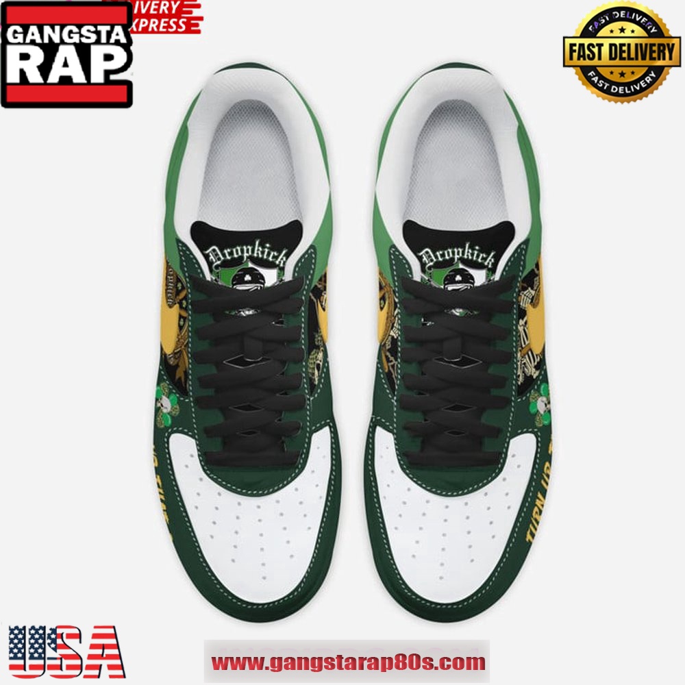 Ideal for both seasonal wardrobe updates and everyday adventures, these sneakers are perfect for the discerning sneaker collector and music lover alike. The Dropkick Murphys Turn Up That Dial Air Force 1 shoes capture the essence of the current streetwear trend, ensuring that wearers stand out in any setting.