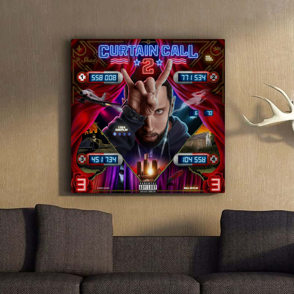 Elevate your music collection with the Eminem New Greatest Hits Album Curtain Call 2 Canvas. This striking piece of art is not just a decor item; it’s a vibrant tribute to one of hip hop’s most iconic artists. Whether you’re an avid collector of Eminem’s discography or simply a fan of chart-topping music, this canvas brings together the essence of Marshall Mathers’ illustrious career.