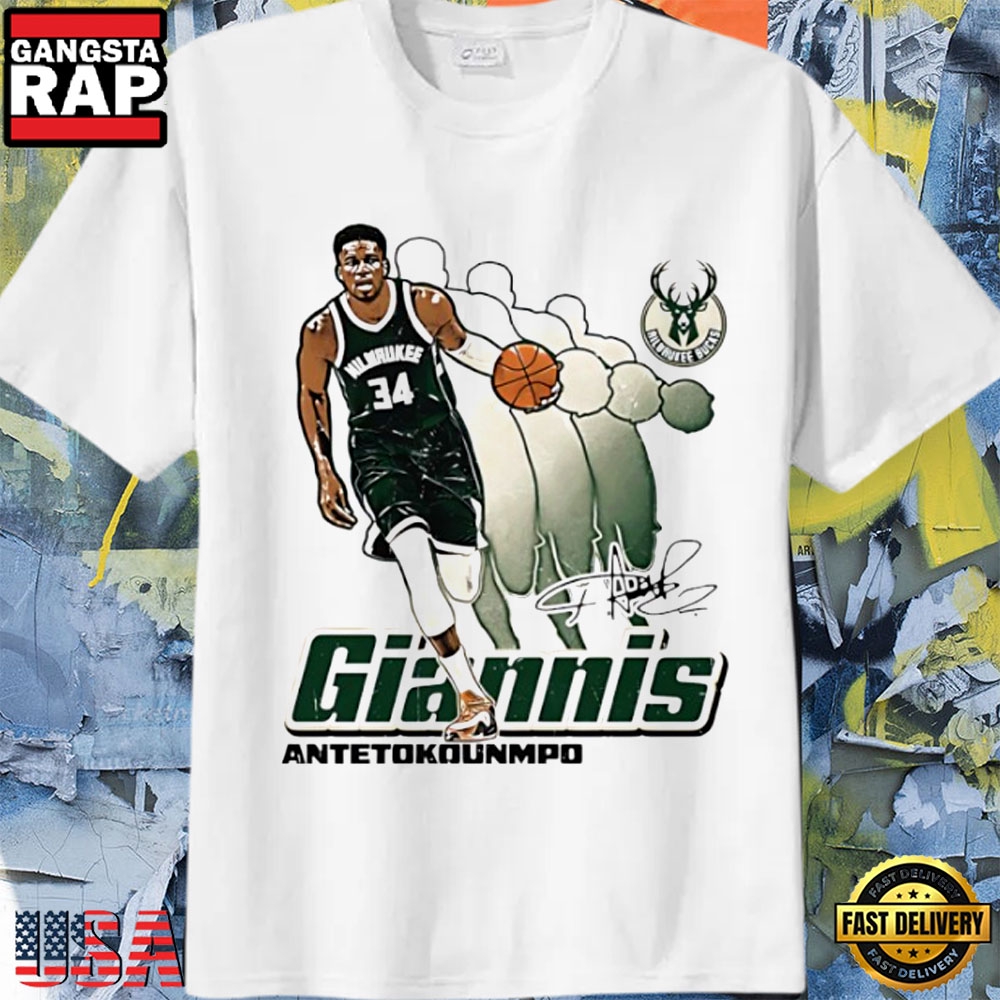 Photos Of Giannis Antetokounmpo Milwaukee Bucks Signed Retro Basketball Player T-Shirt