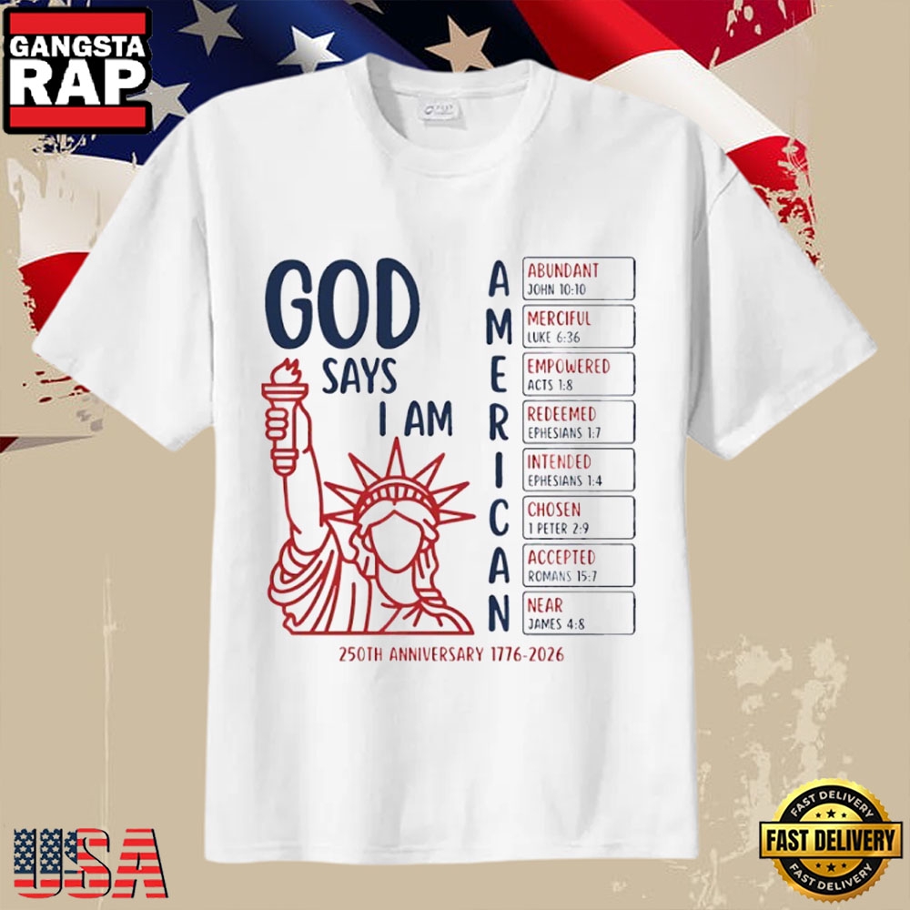 God Says I Am American 1776–2026 250 Years USA Pride 4th of July T-Shirt Introducing our 2D Shirt, a unique blend of style and creativity. Crafted from high-quality fabric, this shirt features a captivating 2D graphic design that adds a bold statement to your wardrobe. With its vibrant colors and intricate details, it offers a modern twist on classic apparel. Elevate your fashion game with our 2D Shirt, designed to turn heads and express your individuality in style.