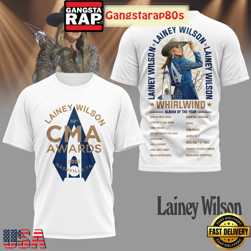 Get ready to stand out and celebrate the power of music with the Lainey Wilson Whirlwind Album Of The Year CMA Awards T-Shirt. This garment doesn’t just represent an album; it embodies the spirit of a movement, inviting wearers to be a part of something bigger than themselves. With its compelling design and heartfelt symbolism, it’s more than just clothing—it’s a piece of the 2023 CMA Awards legacy.