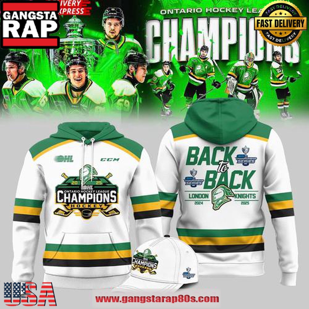 Introducing the London Knights OHL Back-to-Back Champions 2024 – 2025 White Unisex Hoodie, a must-have piece for every true fan of the iconic team. This exclusive hoodie celebrates the unmatched spirit and tenacity of the London Knights, capturing the essence of their incredible achievement in securing back-to-back championships in the 2024 and 2025 seasons.