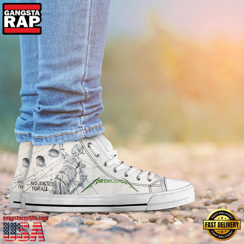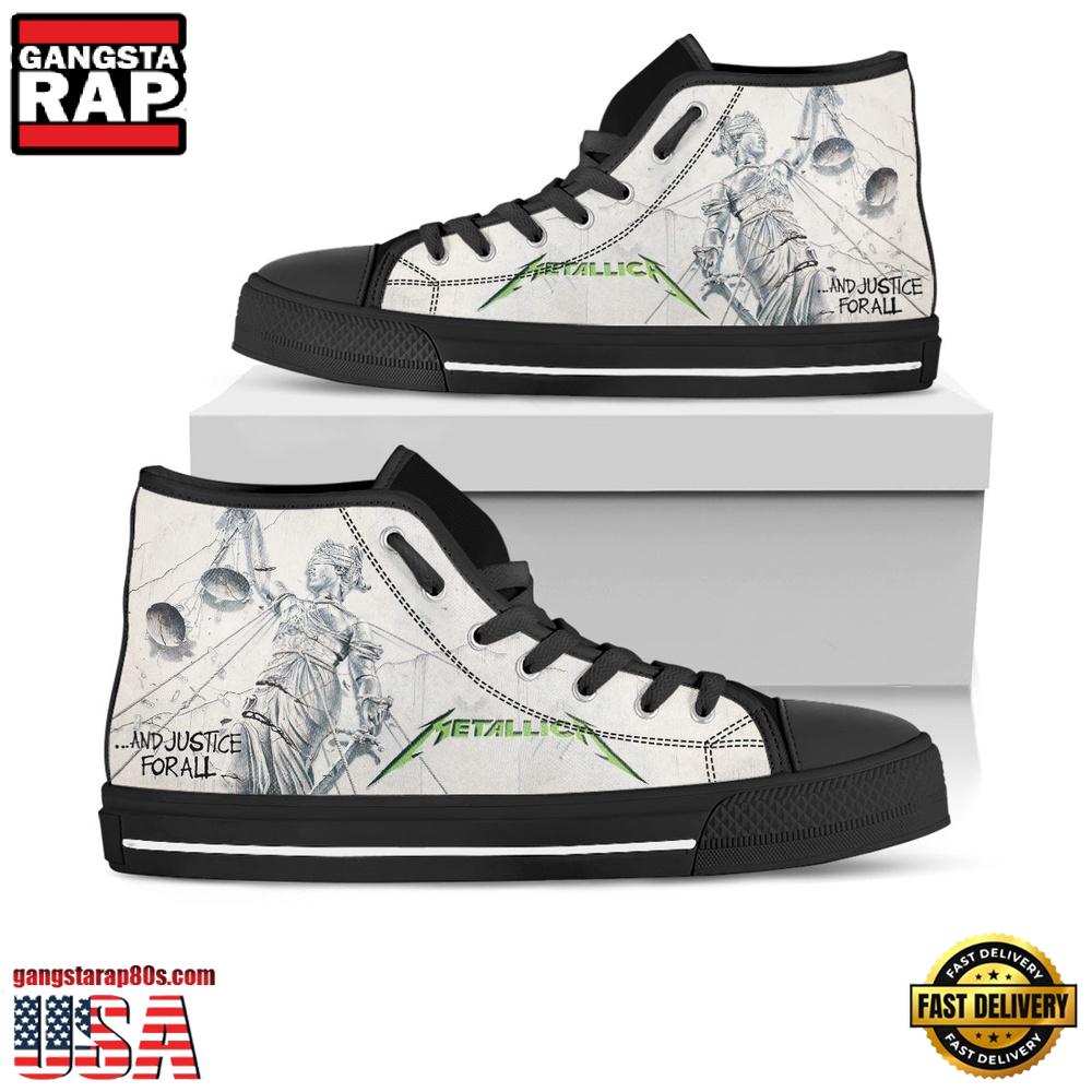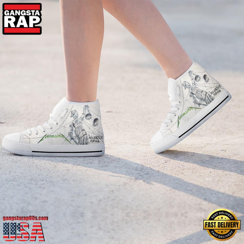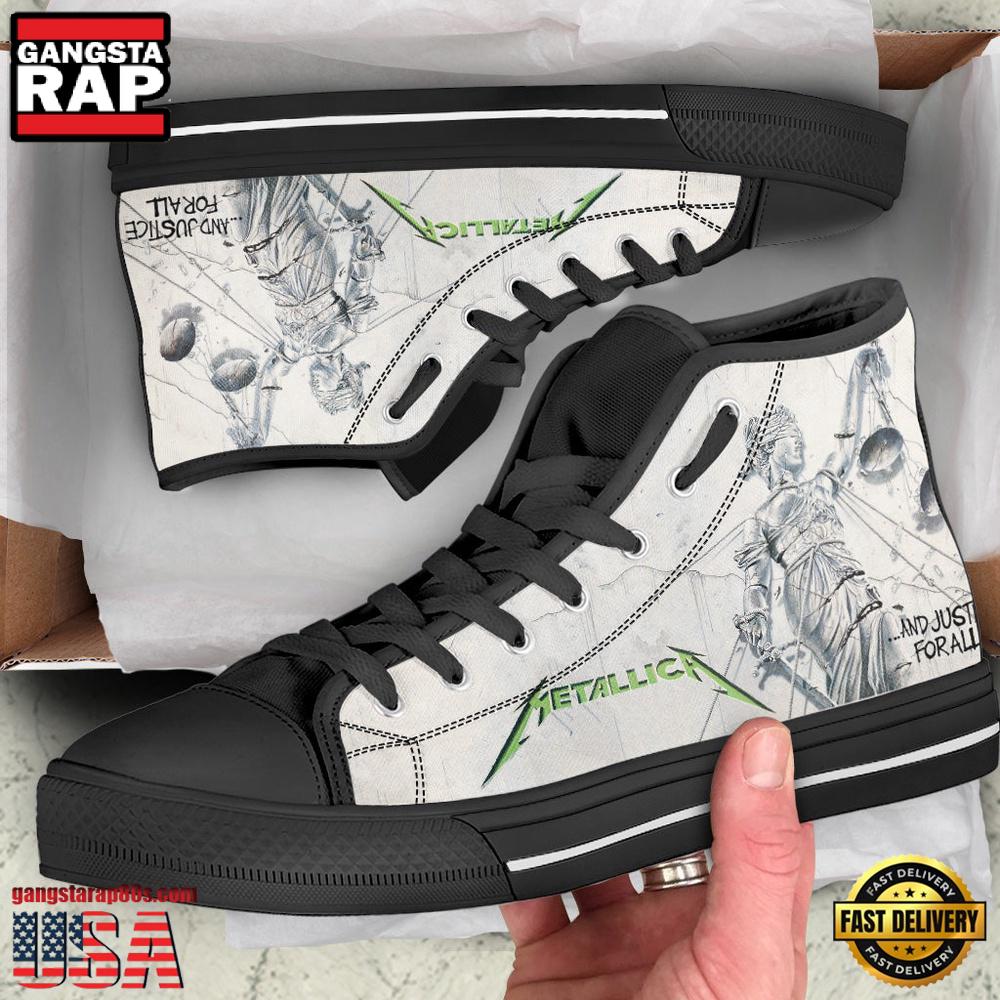 Step into the world of rock ‘n’ roll with Metallica And Justice For All Black & White High-Top Canvas Sneakers. These stylish sneakers are a perfect blend of edgy design and comfort, inspired by the iconic band’s fourth studio album released in 1988. If you’re a fan of Metallica or simply love unique footwear, these sneakers are an ideal addition to your collection.