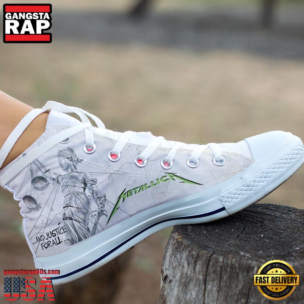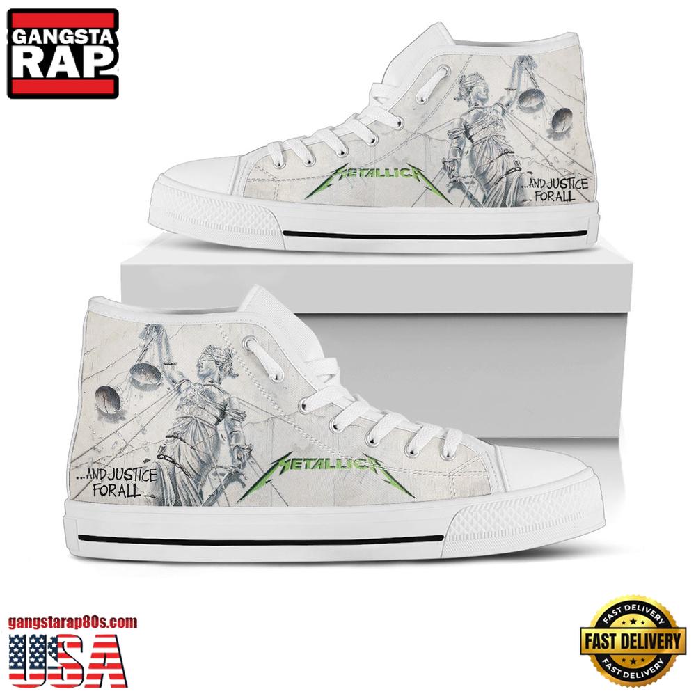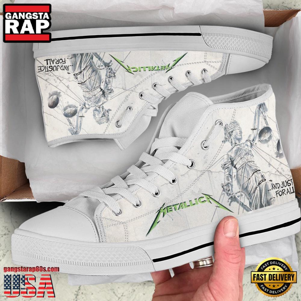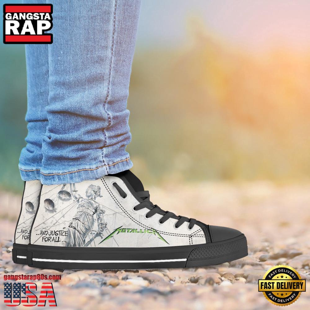 Step into the world of rock ‘n’ roll with Metallica And Justice For All Black & White High-Top Canvas Sneakers. These stylish sneakers are a perfect blend of edgy design and comfort, inspired by the iconic band’s fourth studio album released in 1988. If you’re a fan of Metallica or simply love unique footwear, these sneakers are an ideal addition to your collection.