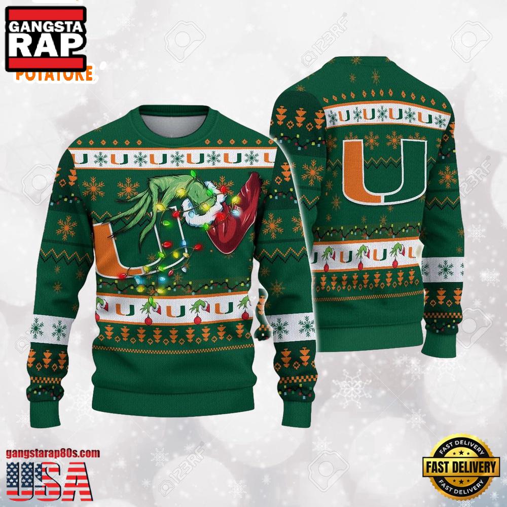 Photos Of Miami Hurricanes Merry Christmas Grinch Hand NCAA Ugly Christmas Sweater