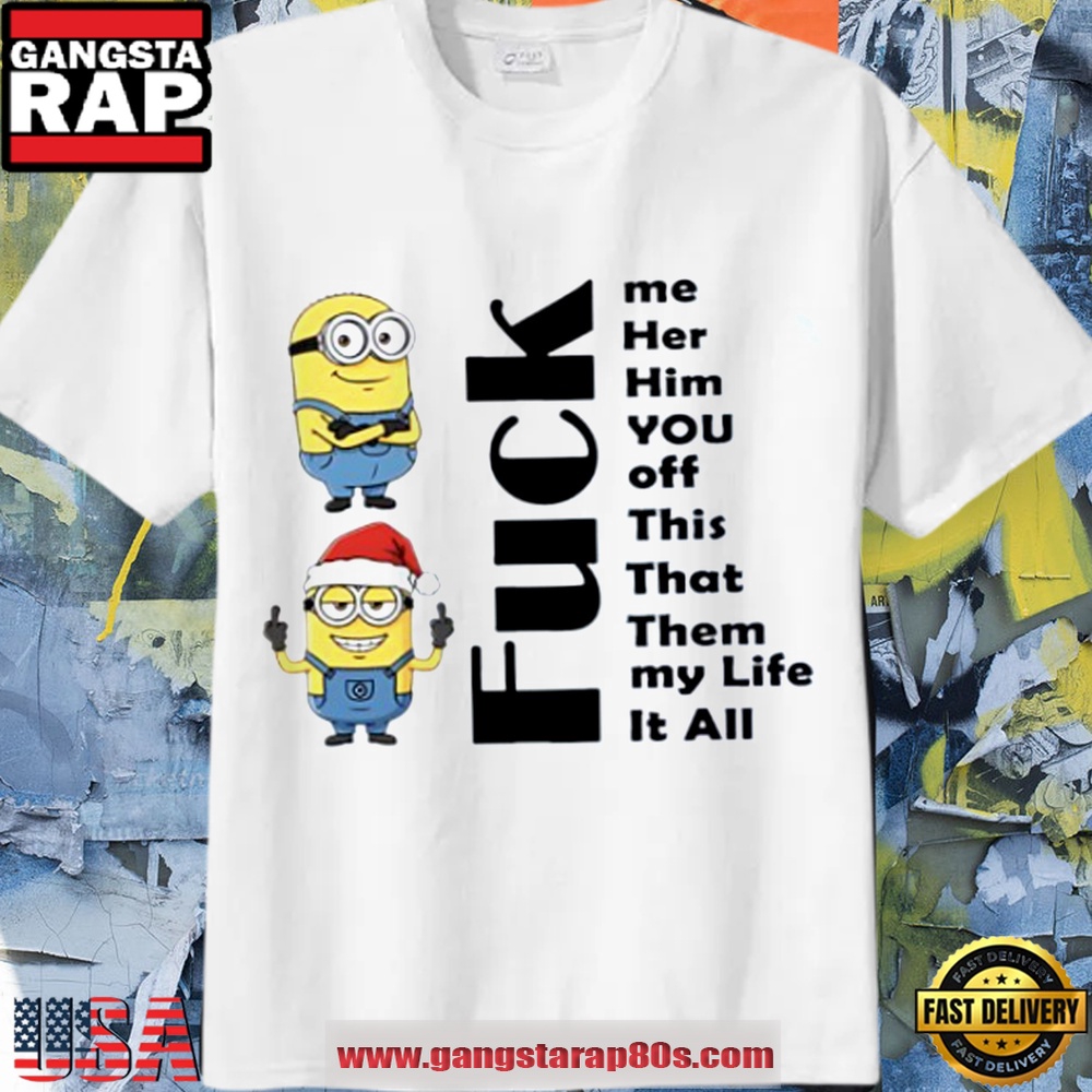 Minions Christmas fuck me her him you off this that them my life it all T Shirt Introducing our 2D Shirt, a unique blend of style and creativity. Crafted from high-quality fabric, this shirt features a captivating 2D graphic design that adds a bold statement to your wardrobe. With its vibrant colors and intricate details, it offers a modern twist on classic apparel. Elevate your fashion game with our 2D Shirt, designed to turn heads and express your individuality in style.