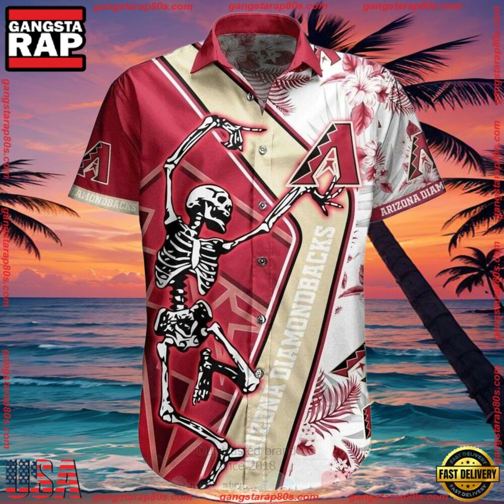 Embrace the vibrant spirit of summer and celebrate your favorite team with the MLB Arizona Diamondbacks Skeleton Batter Tropical Summer Hawaiian Shirt. This eye-catching piece of fan apparel is a must-have for any Arizona Diamondbacks enthusiast looking to stand out during the sunny season.