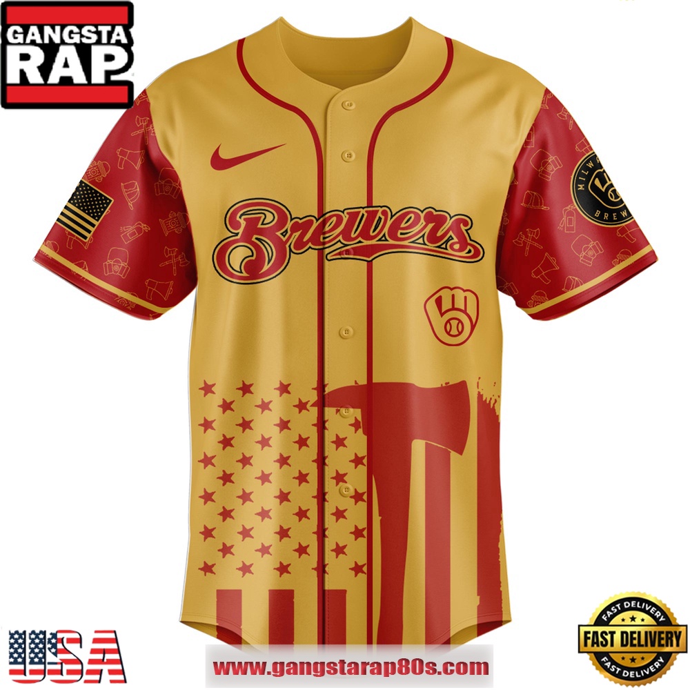 Crafted with state-of-the-art materials, the design of these special edition jerseys embodies the very essence of resilience and community spirit. Featuring striking red and bold yellow elements reminiscent of a firefighter’s uniform, each jersey proudly displays the official Milwaukee Brewers logo, symbolizing a perfect blend of sportsmanship and solidarity.