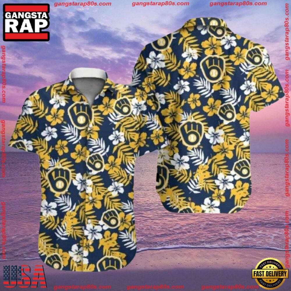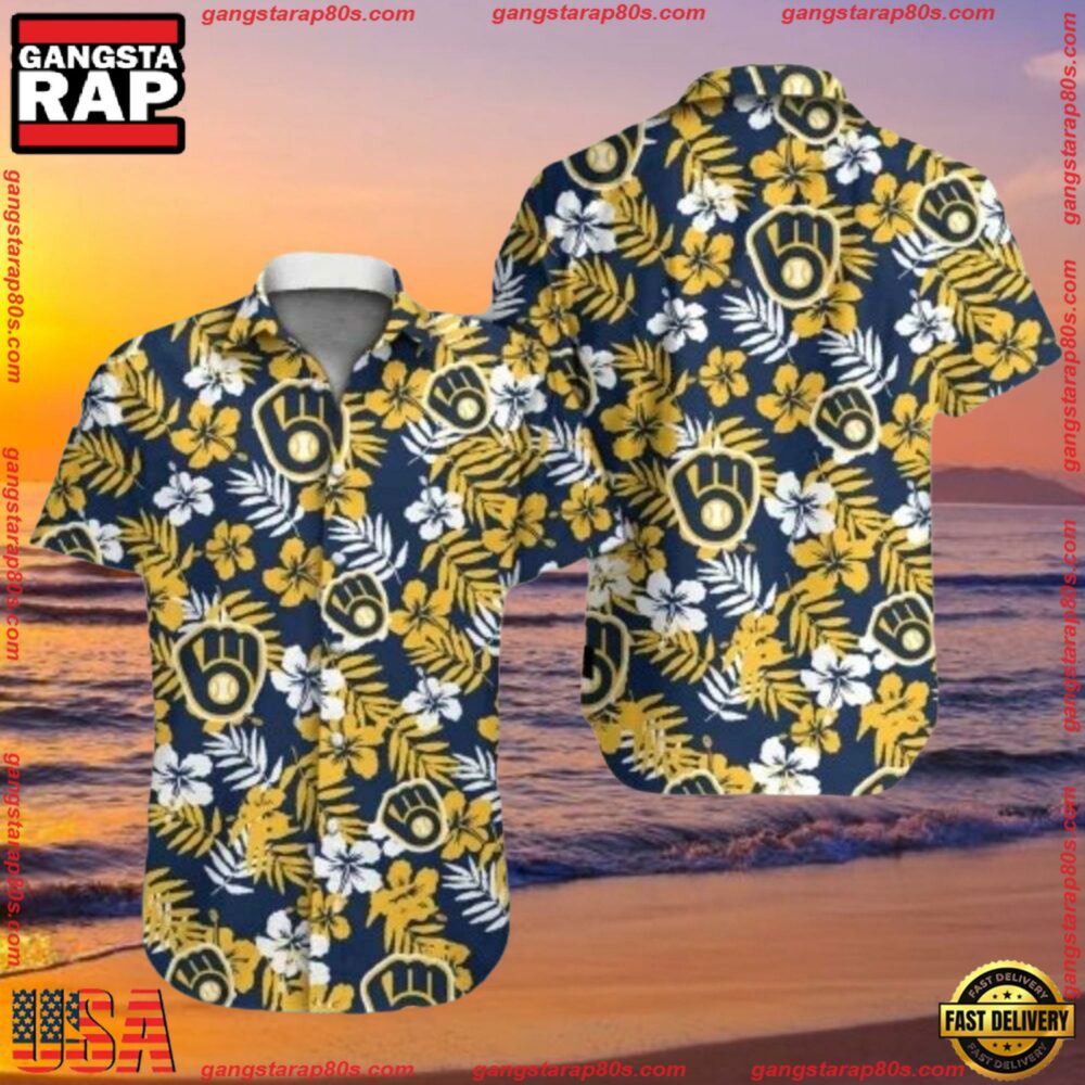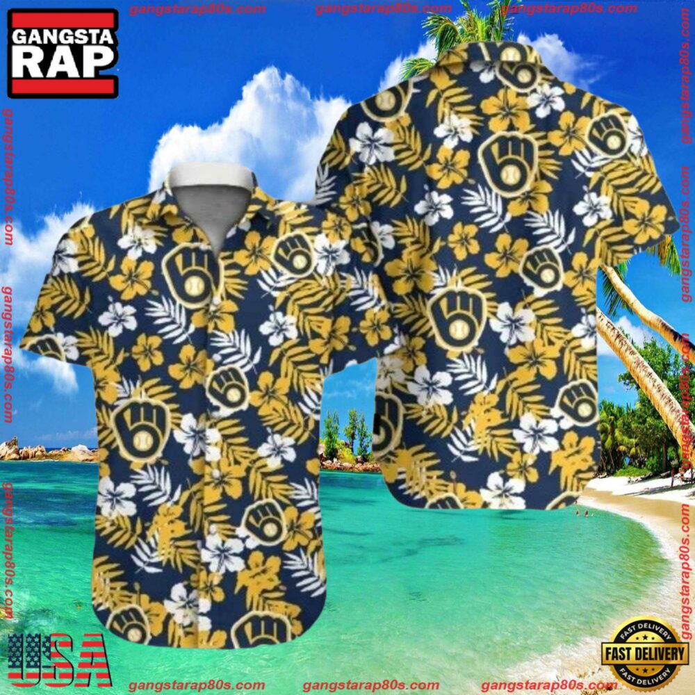Photos Of MLB Nautical Navy Milwaukee Brewers Tropical Floral Summer Hawaiian Shirt