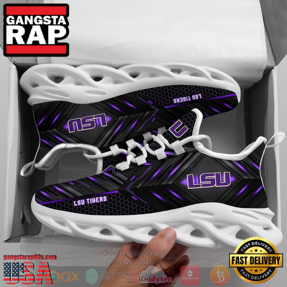 Custom Name options allow you to personalize these shoes, making them an ideal choice for fans who want to flaunt their individuality. The bold tiger-themed motifs are a nod to the fierce spirit of the LSU Tigers, while the Max Soul technology provides unparalleled comfort and support, ensuring you can run, jump, and roar with enthusiasm.