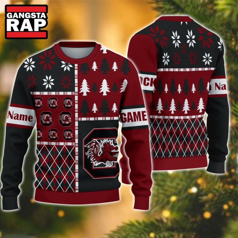 Product details: NCAA South Carolina Gamecocks Football Team Xmas Tree Snow Custom Name Ugly Christmas Sweater