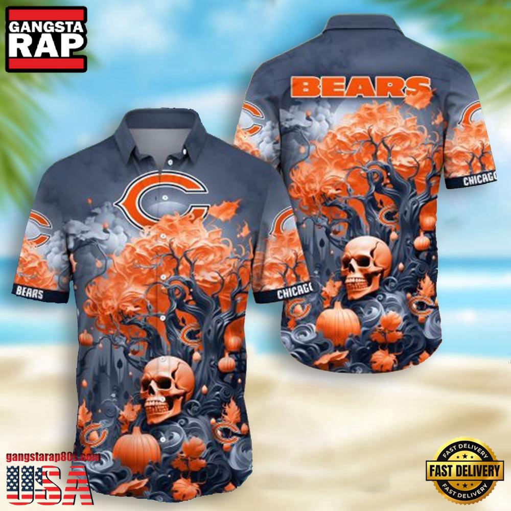Do not miss out on owning this exclusive piece of NFL fan merchandise that effortlessly combines team pride with fashionable design. Shop now to secure your Chicago Bears Skull Pumpkin Hawaiian Shirt and wear your loyalty with pride this season!