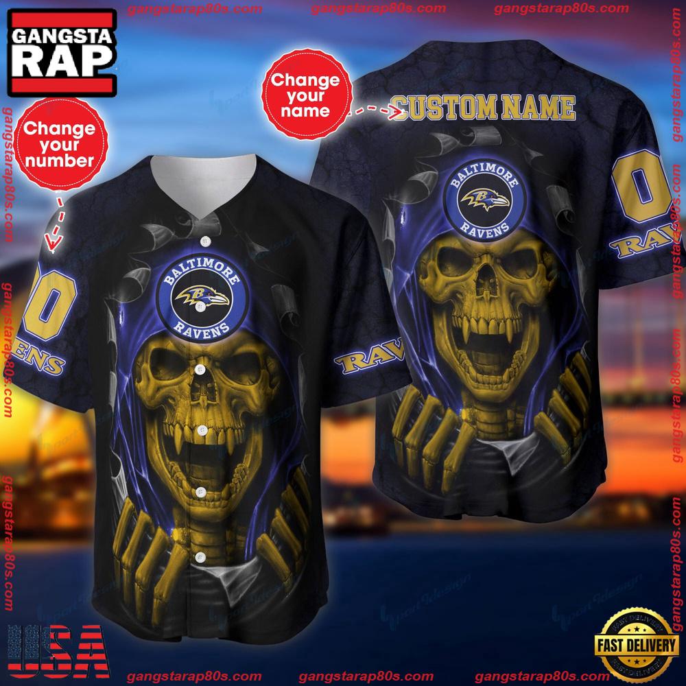 Introducing the unique NFL Custom Name and Number Team Baltimore Ravens Skull Pattern Baseball Jersey Shirt — a must-have for any proud Ravens fan! In the world of sports fashion, team spirit never goes out of style, and this jersey is a perfect blend of loyalty and trendsetting design.
