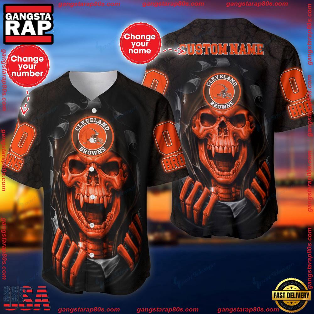 Elevate your fan wardrobe with the NFL Custom Name and Number Team Cleveland Browns Skull Pattern Baseball Jersey Shirt, a must-have for dedicated fans of the Browns. Designed with passion and crafted for comfort, this unique piece blends sports tradition with modern fashion, making it a standout for any fan collection.