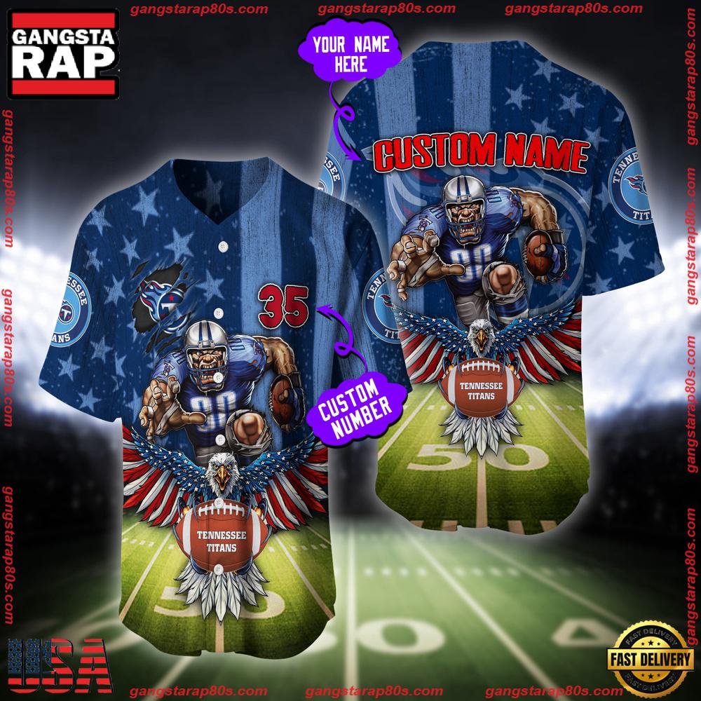 Discover the ultimate fan gear with our customizable Tennessee Titans Mascot US Flag Baseball Jersey Shirt. Designed for die-hard fans who want to show off their team spirit, this jersey offers a unique blend of style and patriotism. Whether you’re heading to a game or just enjoying a casual outing, this shirt ensures you stand out while representing your favorite NFL team.