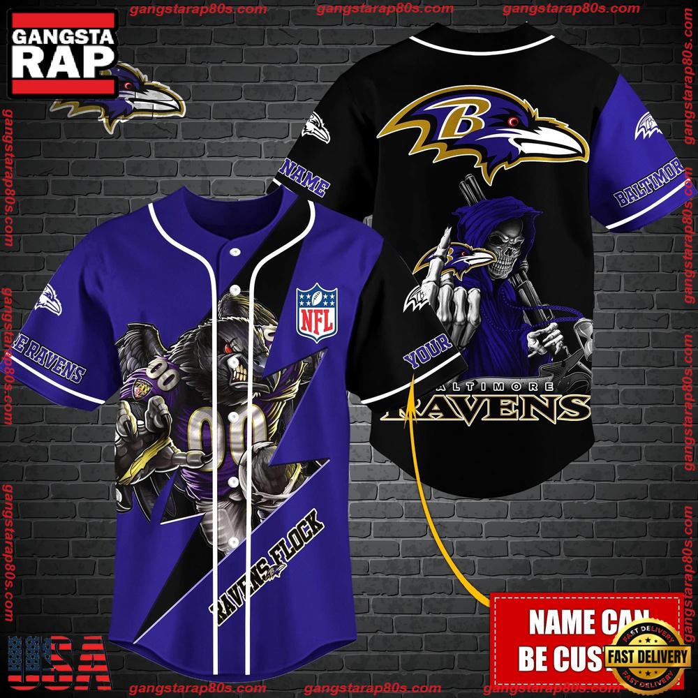 The NFL Custom Name Baltimore Ravens Mascot And Skull New Design Baseball Jersey is not just apparel; it’s a celebration of identity and passion. Wearing it, you become part of a legacy, marching alongside a community of dedicated fans. Don’t miss out on owning this remarkable design – a collectible for any true Ravens supporter.