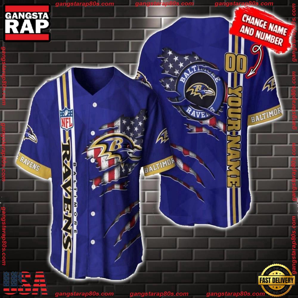 - NFL Custom Name Number Baltimore Ravens American Flag New Design Baseball Jersey Shirt