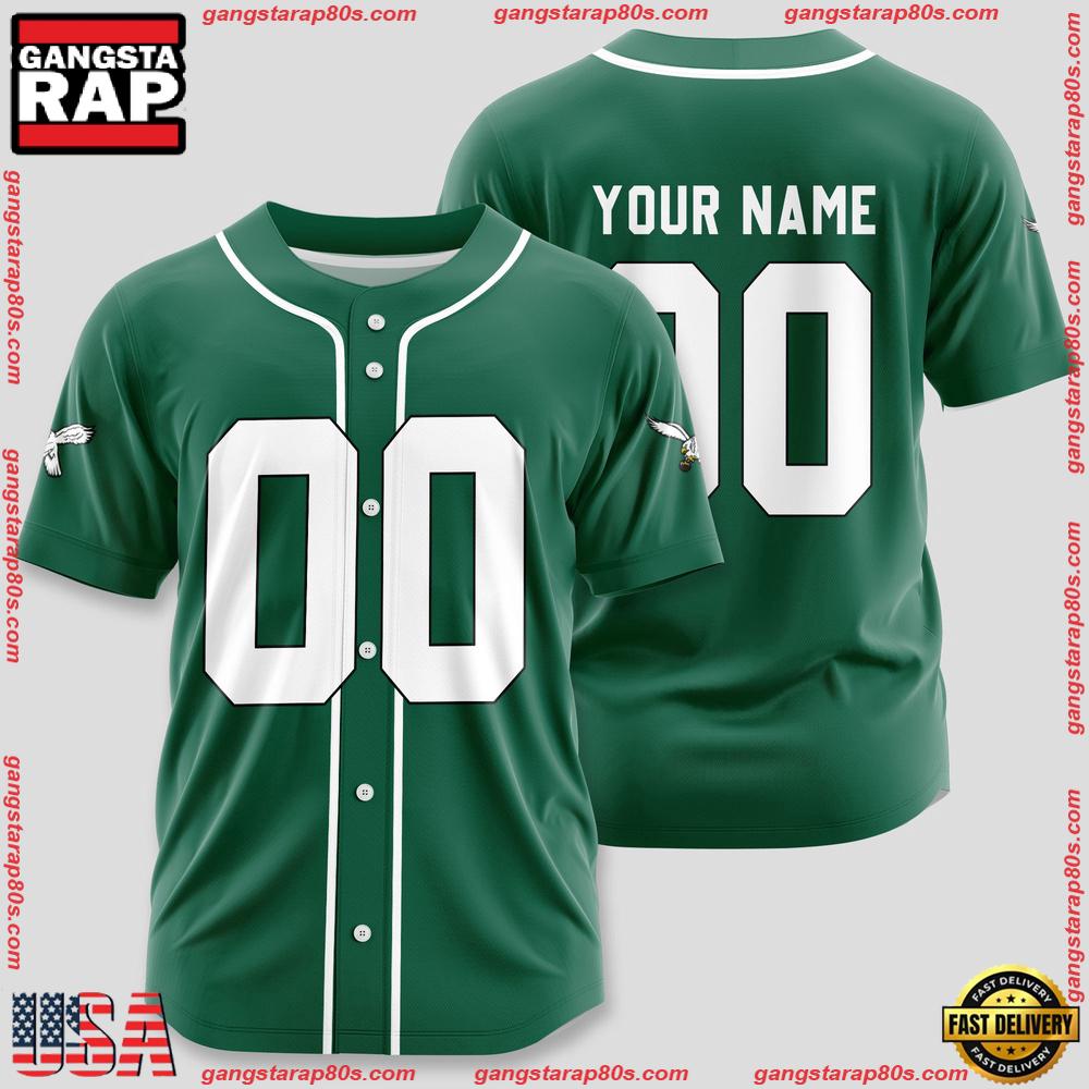 This jersey stands out with its high-quality fabric and exceptional comfort, making it ideal for any activity, from game days to casual outings. The shirt combines the timeless appeal of a baseball jersey with the modern styling and colors of the Philadelphia Eagles, making it a versatile addition to your sports wardrobe.