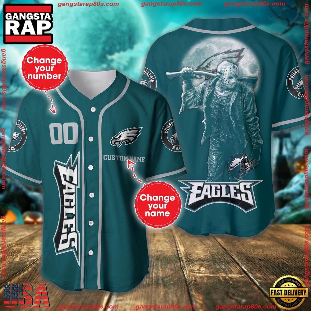 Perfect for the targeted demographic of Eagles fans who love sports and horror, this baseball jersey can be styled effortlessly with jeans or joggers, bringing versatility to your wardrobe. Let your love for the Philadelphia Eagles and horror merge seamlessly as you step out in style with this one-of-a-kind jersey.