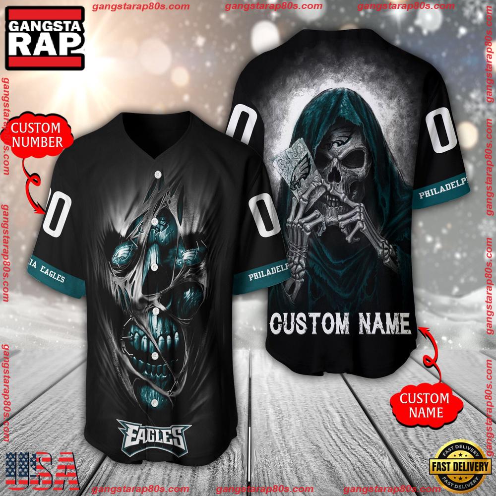 Your support doesn’t just wear well; it makes a statement. Whether you’re cheering from the bleachers or enjoying the game at home, the NFL Custom Name Number Philadelphia Eagles Team Skull Death Baseball Jersey Shirt promises to be a wardrobe staple for any true Eagles fan. Embrace the season with gear that expresses both your passion and your unique flair, all while being a part of the growing trend for personalized sports apparel in 2023.