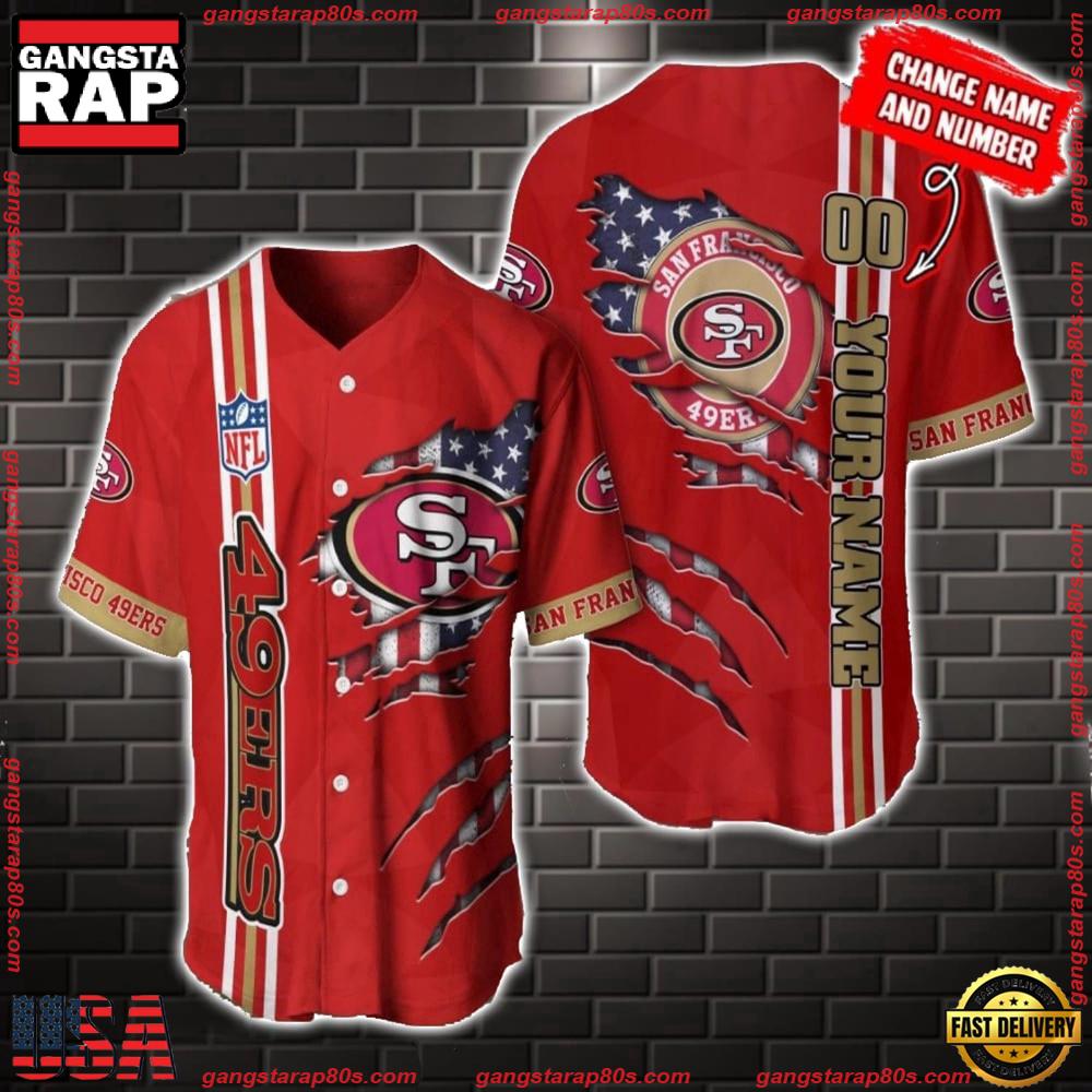 Show your team spirit with this NFL Custom Name Number San Francisco 49ers America Flag New Design Baseball Jersey Shirt, the perfect gift for passionate fans of the 49ers. This custom jersey shirt is not only a testament to your loyalty to the team but also a staple for anyone looking to combine patriotism with sports fashion. The standout feature of this jersey is its unique America flag design, which elegantly merges the spirit of the NFL with national pride. Whether you’re cheering from the stands or watching from home, this shirt is designed to make you feel part of the game.