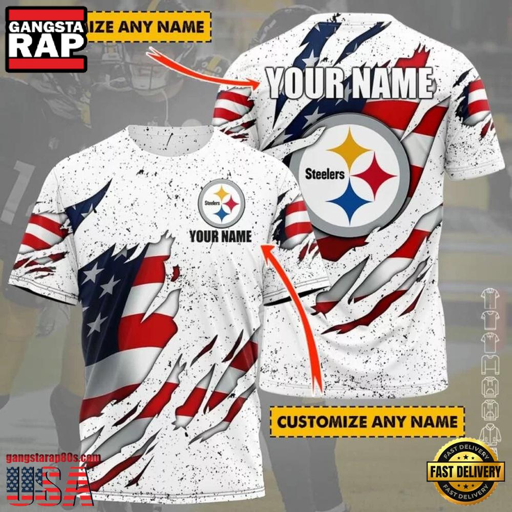 Celebrate your love for both the Pittsburgh Steelers and the USA with this stunning all-over print T-shirt. Perfect for fans looking to showcase their passion in a unique and personalized way, this custom name T-shirt seamlessly merges style, patriotism, and team spirit.