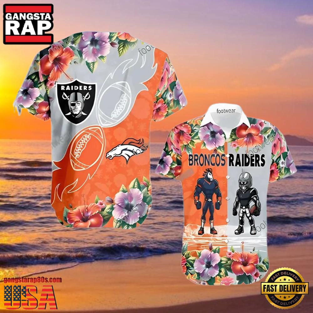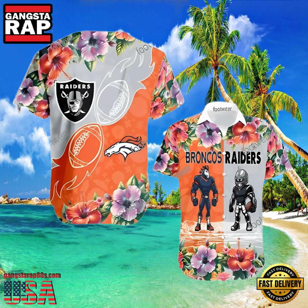 Photos Of NFL Denver Broncos Vs Las Vegas Raiders Surfboard Logo Beach Hawaiian Shirt