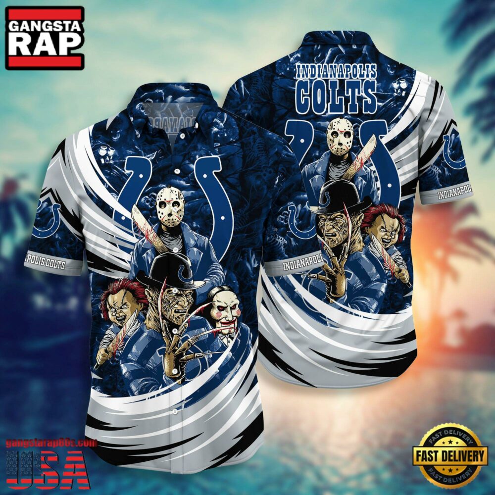 Step into the spooky season with the ultimate fashion statement: the NFL Indianapolis Colts Halloween Horror Movies Hawaiian Shirt designed for both men and women. This 2023 exclusive release brings a unique blend of sports enthusiasm and autumn festivities directly to your wardrobe. Perfect for Halloween and beyond, this shirt features a striking combination of your favorite Indianapolis Colts logos intertwined with classic horror movie motifs, all presented in a vibrant Hawaiian theme.