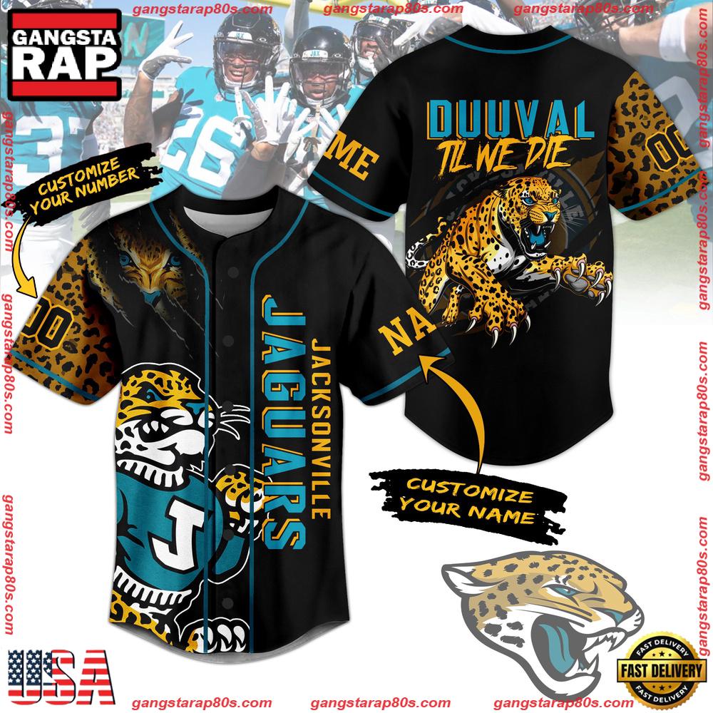 Experience the ultimate blend of style and team spirit with the NFL Jacksonville Jaguars Duuval Til We Die Custom Name Number Baseball Jersey. This unique jersey is a must-have for any devoted Jacksonville Jaguars fan, seamlessly combining the traditional aesthetics of a baseball jersey with the bold energy of your favorite football team.