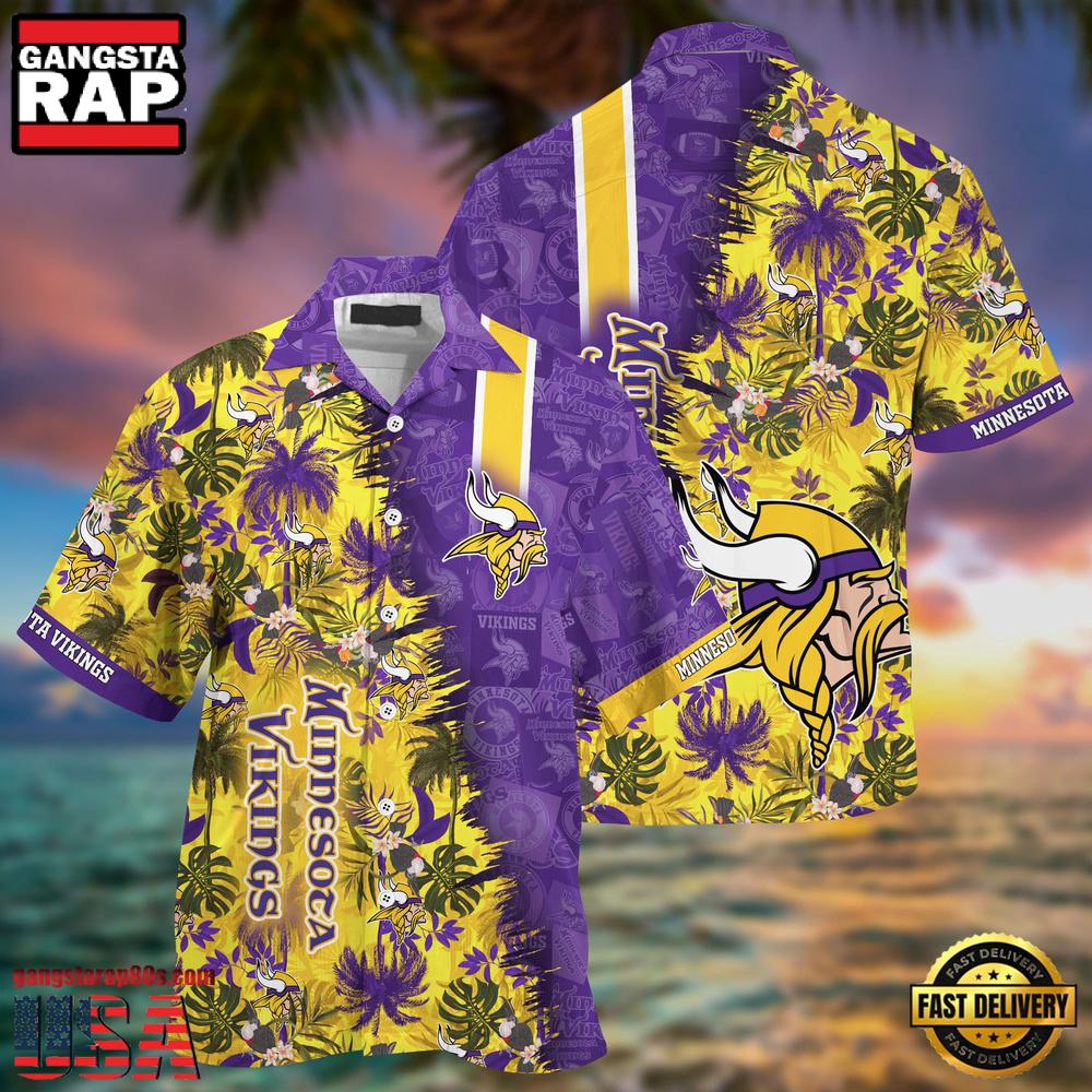 Featuring an eye-catching design inspired by Hawaiian motifs, this shirt blends the traditional aloha wear with bold elements of the Vikings’ iconic purple and gold colors. The shirt’s print includes subtle yet distinctive nods to the team’s logo, ensuring you stand out at any game-day gathering or casual outing.