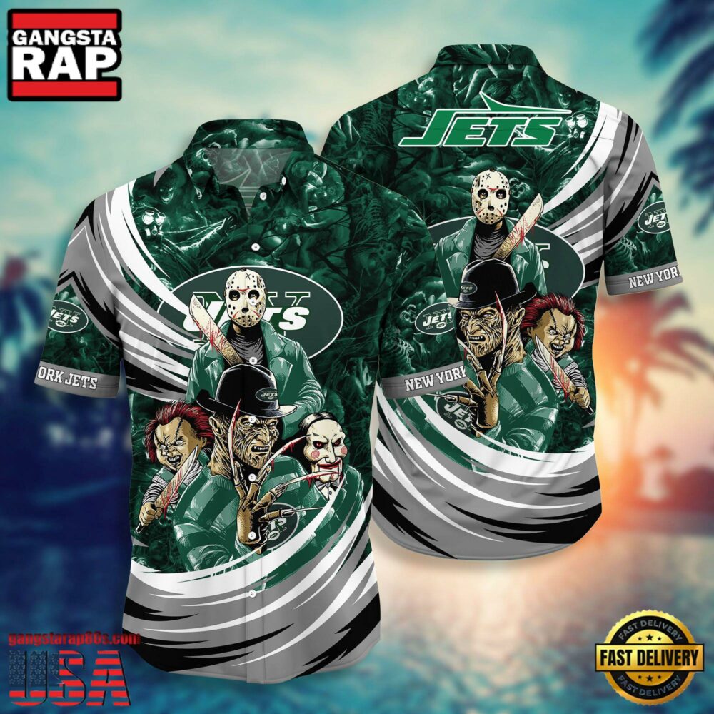 Shop now to secure your limited edition NFL New York Jets Halloween Horror Movies Hawaiian Shirt and bring your love for the sport and spooky season to life!