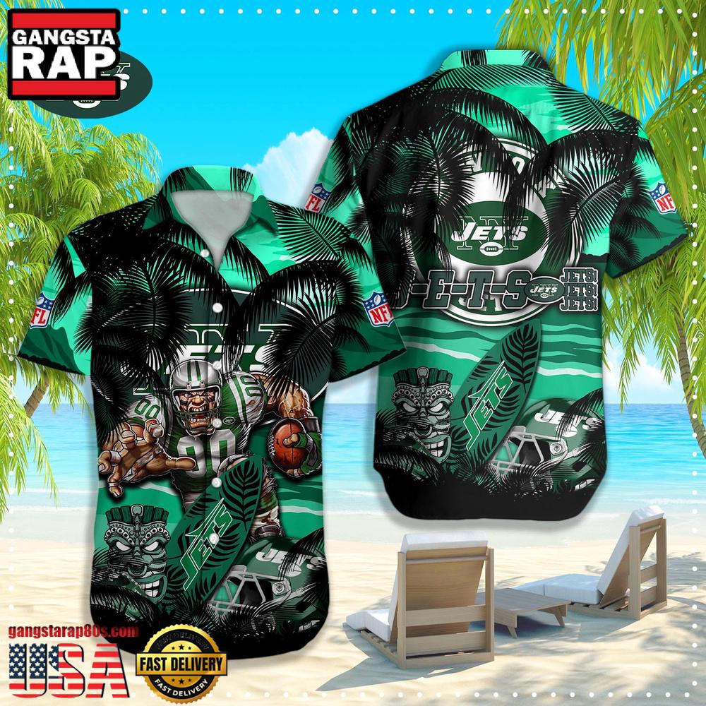 The design subtly incorporates the iconic New York Jets colors, emblazoned with the team’s emblematic logo set against a colorful, tropically inspired background, drawing in elements that are distinctly New York. With its lightweight and breathable fabric, it’s perfect for warm weather, making it a seasonal must-have for fans as the temperatures rise.