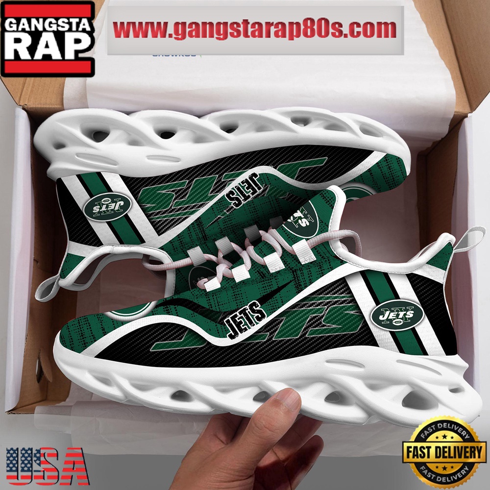 The unique design of these sneakers ensures you stand out in the crowd. Featuring official New York Jets colors and logos, they are ideal for showcasing your team pride at games or casual outings. The state-of-the-art Max Soul technology provides exceptional comfort, making them perfect for long-distance running or daily wear.