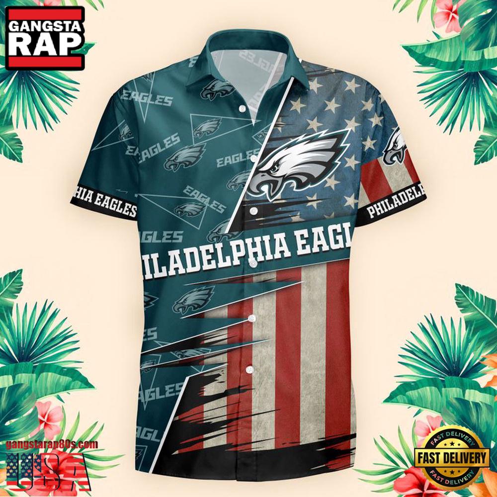 The design features the classic US flag motif intertwined with the iconic Eagles emblem, making it a unique addition to any fan’s wardrobe. This Hawaiian shirt captures the essence of patriotic pride and team loyalty, making it a must-have for any Philadelphia Eagles fan. Whether you’re a lifelong supporter or new to the Eagles’ community, this shirt lets you proudly display your fandom.
