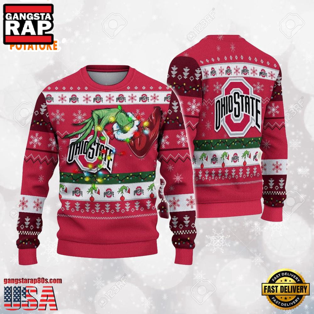 Photos Of Ohio State Buckeyes Merry Christmas Grinch Hand NCAA Ugly Christmas Sweater