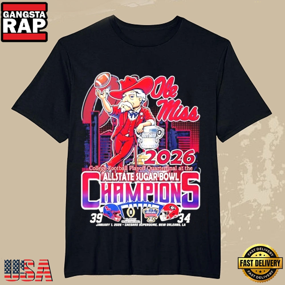 Ole Miss Rebels Mascot 2026 College Football Playoff Quarterfinal Allstate Sugar Bowl Champions T-Shirt Introducing our 2D Shirt, a unique blend of style and creativity. Crafted from high-quality fabric, this shirt features a captivating 2D graphic design that adds a bold statement to your wardrobe. With its vibrant colors and intricate details, it offers a modern twist on classic apparel. Elevate your fashion game with our 2D Shirt, designed to turn heads and express your individuality in style.