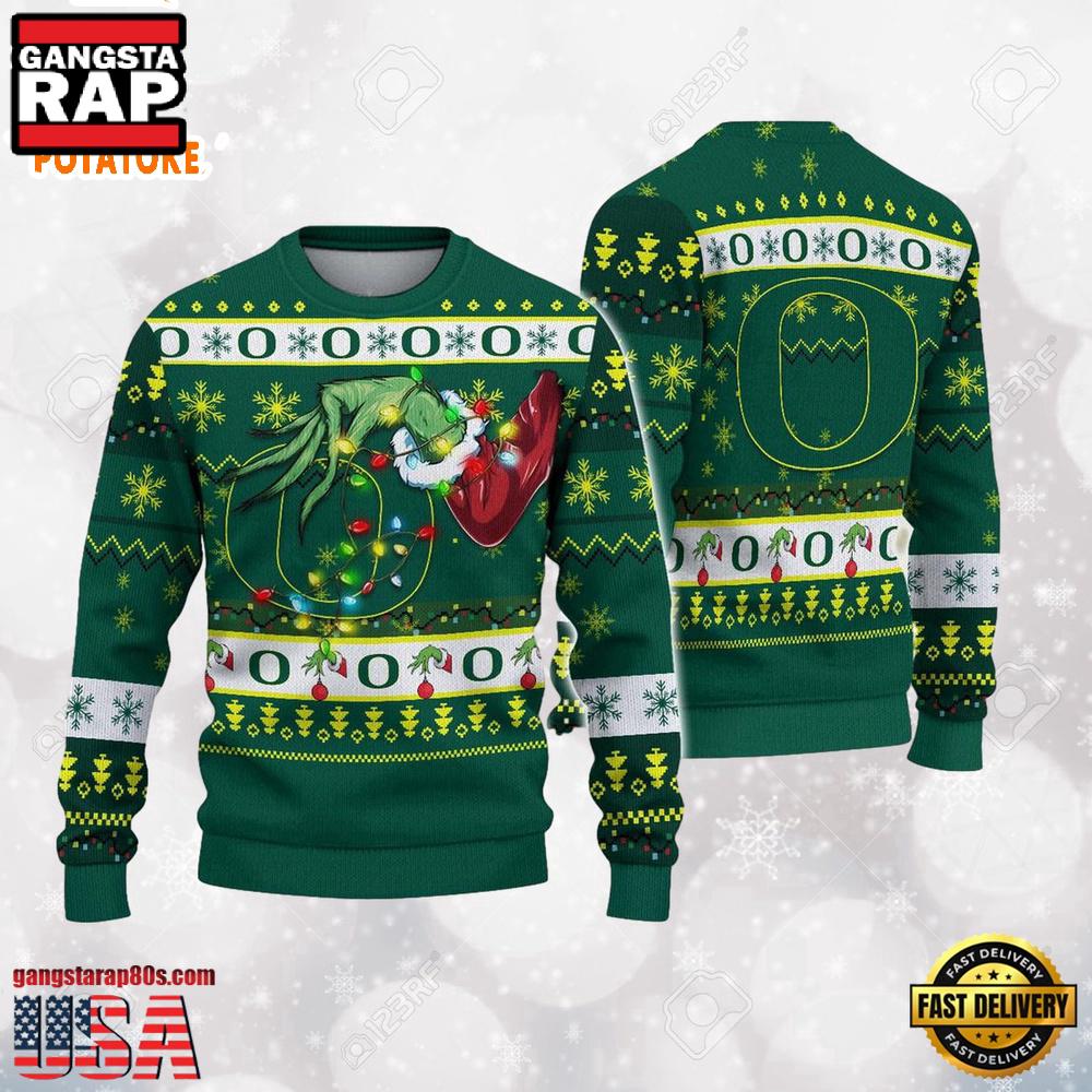 Photos Of Oregon Ducks Merry Christmas Grinch Hand NCAA Ugly Christmas Sweater