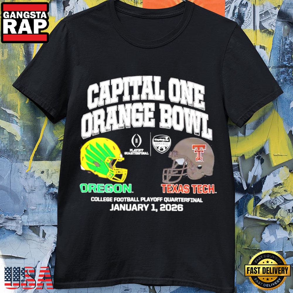 Photos Of Oregon Ducks vs Texas Tech CFP 2025 Capital One Orange Bowl Helmet to Helmet T Shirt