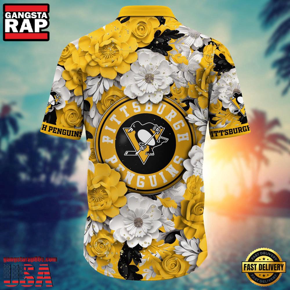 Designed for those who bleed black and gold, the shirt features iconic design elements that capture the essence of the Pittsburgh Penguins. The team’s emblem is seamlessly integrated into the shirt’s dynamic patterns, providing an exciting way to showcase allegiance to your favorite NHL team. Long-tail keywords like “Penguins fan Hawaiian shirt” and “NHL tropical apparel” make it easy for fans to find this season’s hottest trend online.