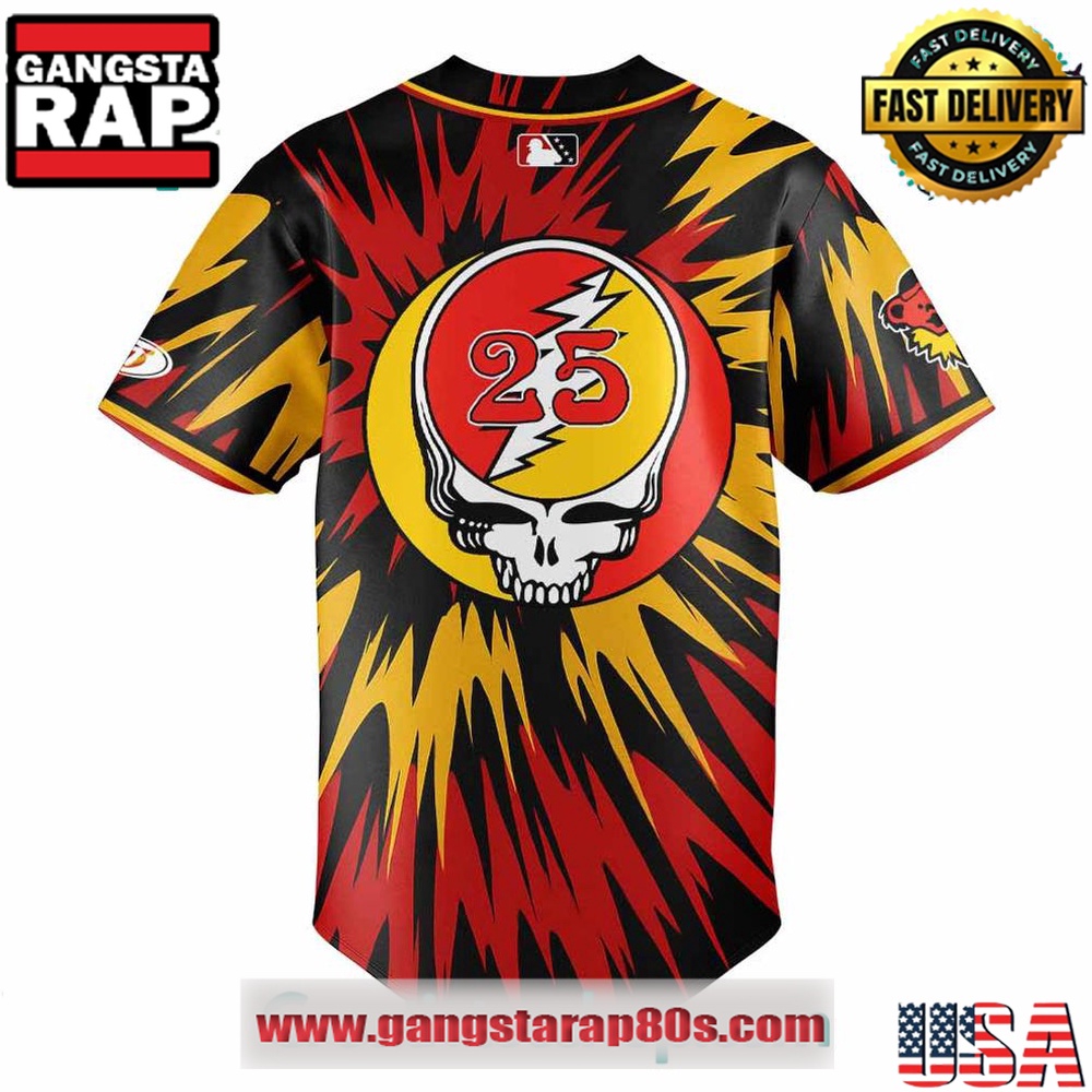 Crafted with meticulous attention to detail, this jersey features vibrant design elements that pay homage to the Grateful Dead’s psychedelic aesthetic. The blend of bold team colors with the classic Grateful Dead motifs ensures that it catches the eye both on and off the field. The jersey’s high-quality fabric guarantees comfort, whether you’re at a game or a concert, making it a versatile choice for various occasions.
